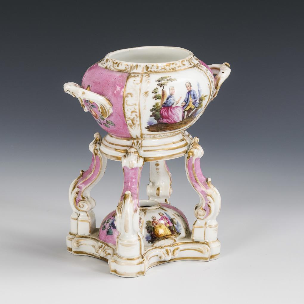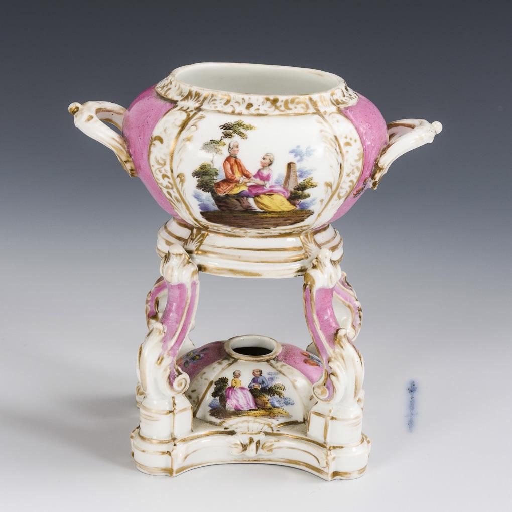 Perfume vessel with two handles standing on curved, leaf-relief feet above a burner. Painted in the manner of Dresden porcelains with alternating pink fond fields and fields with Watteau painting. Gold rubbed, without lid.