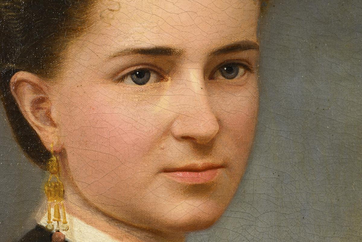 Portrait of a young woman in high-necked dress with gold jewelry before indicated cloudy sky. The picture comes from the Lower Franconian castle Ditterswind and probably shows a member of the family Fuchs von Bimbach und Dornheim. Altersspuren.