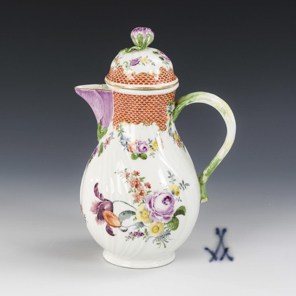Form "Neuozier". Pear jug with branch handle and flower knob lid. Under a red scale border floral garlands and floral bouquets. Bumped on the lid inner rim and snipe, flower knob bumped.