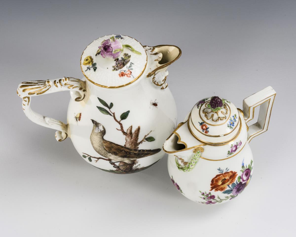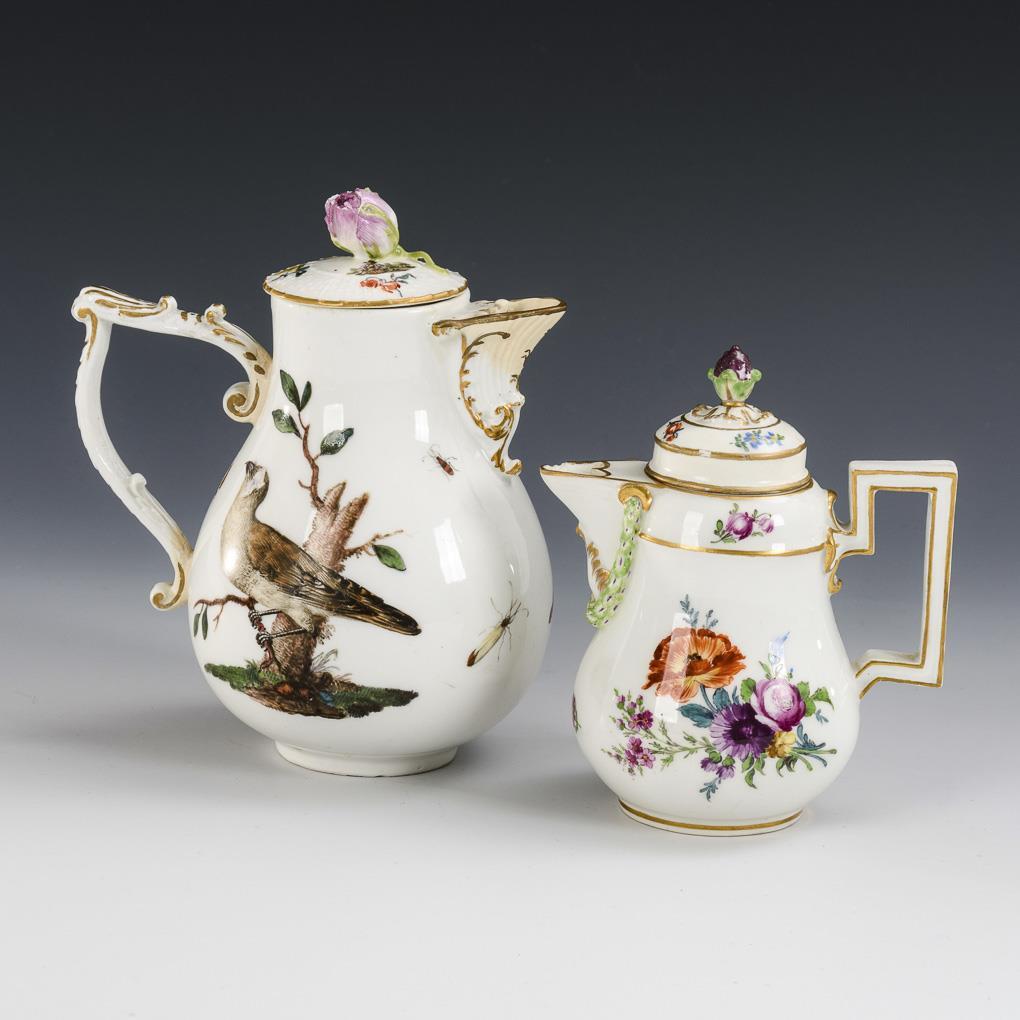 1x sword mark, c. 1750: pear jug with rocaille flared handle, finial and completed rose finial lid; on both sides the representation of a bird (including a spotted woodpecker). / 1x sword mark with star, Marcolini period, 1774-1814: pear jug with angled handle, a laurel wreath on the snipe and flower knob lid. 1x handle and snipe restored. / 1x lid restored and bumping on the snipe.