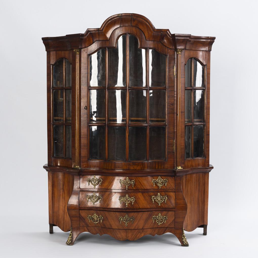 2-piece top cabinet with 1-door display case top and 3-bay chest of drawers bottom in style-typical curved form; decorated with vegetal bronze fittings, curved pediment, half columns and sprouted display case glass; inside 2 shelves. Traces of age/use, restored.