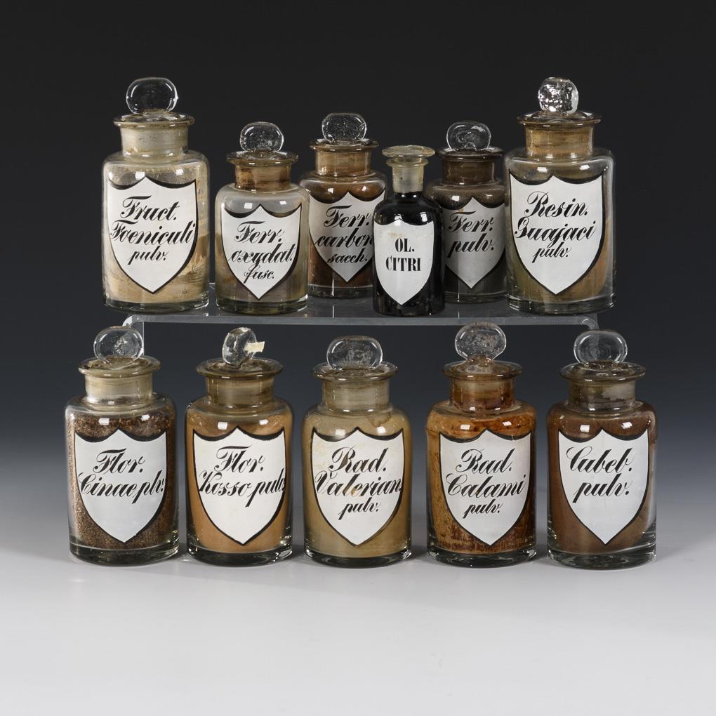 Cylindrical bottles with inscriptions; demolition. Predominantly with contents.