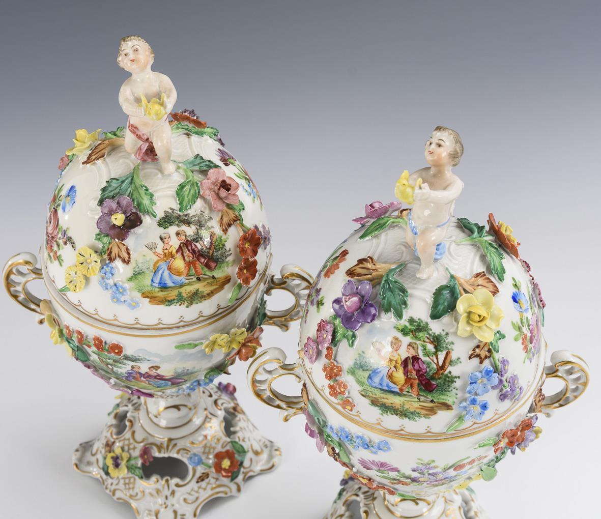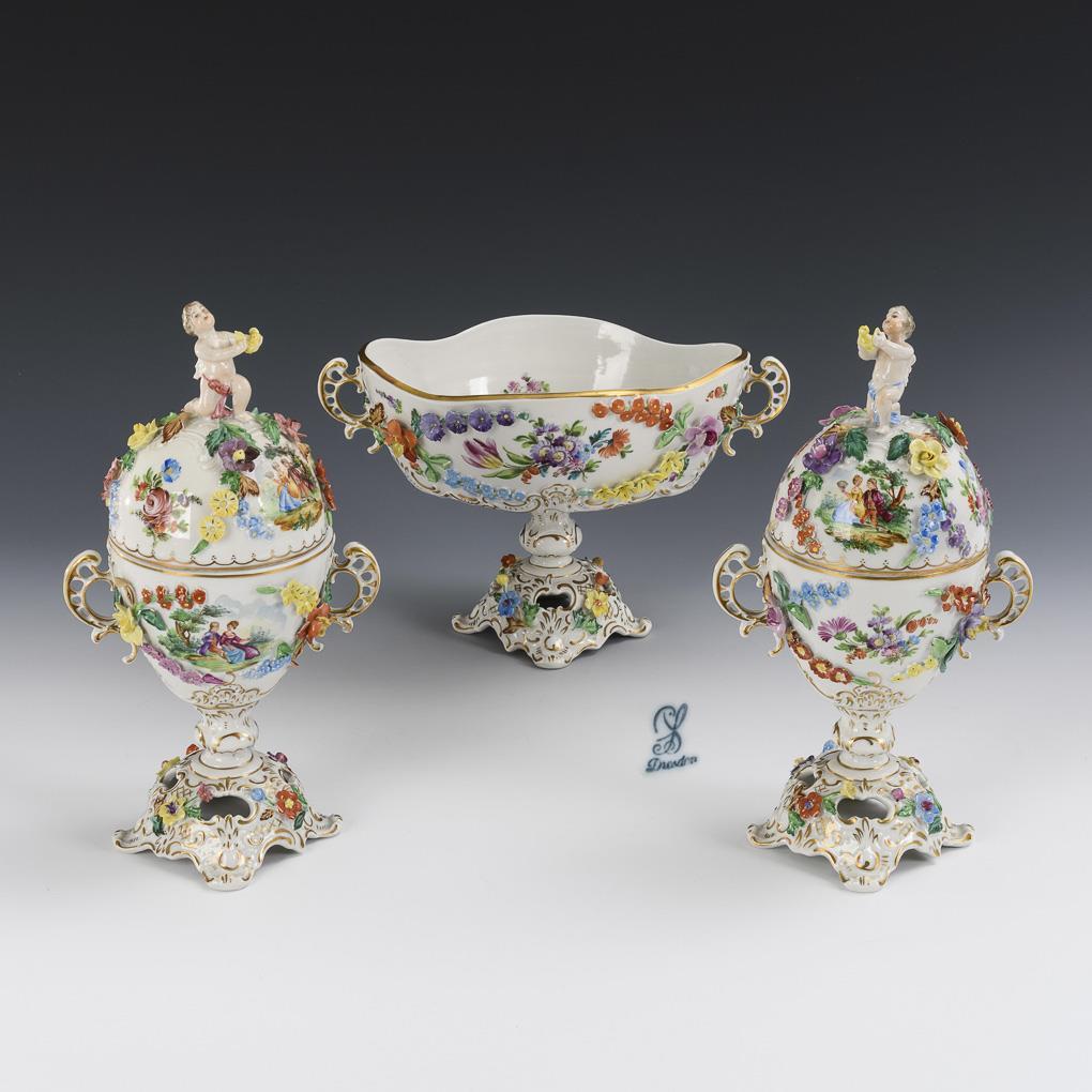 Four-pass oval footed bowl (h 16 cm) and 2 small lidded vases with two handles, putto knob lid and openwork rocaillerelieffuß (h 25 cm). All with rich floral decoration and Watteau painting on the front. Minimal bumps on the coating.