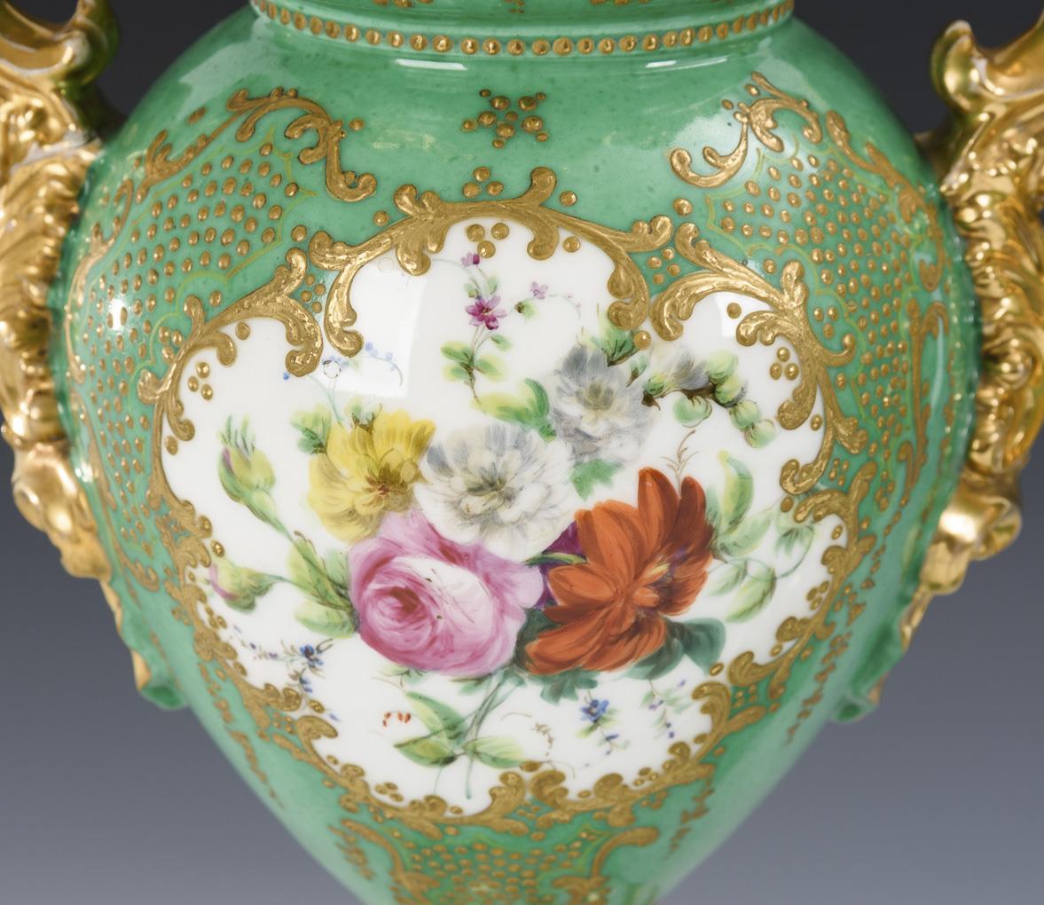 Amphora vases with two rocaille handles, multi-pass rim and round base, on square base. Green background with rich gold relief painting and a cartouche on the front with a bouquet of flowers. Gold partially rubbed, 1x mouth rim restored.