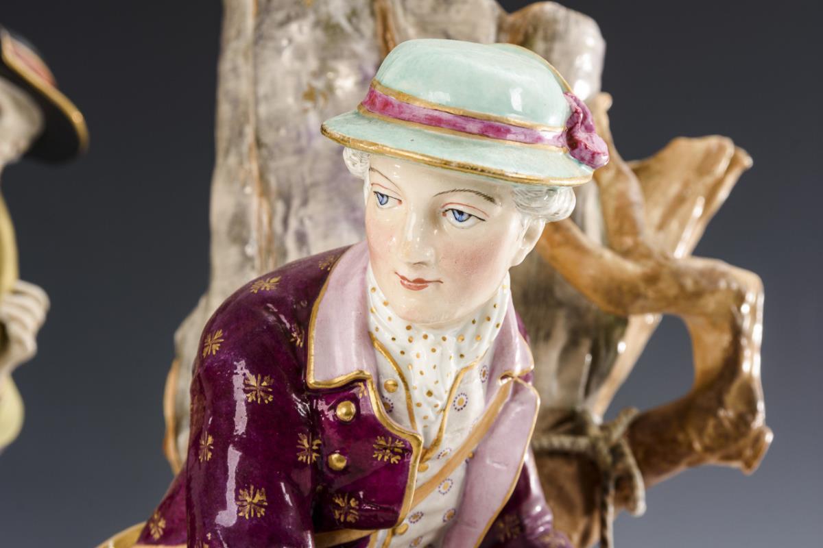 At a tree trunk as a vase standing, a hunting horn blowing hunter or standing hunter with killed pheasant. Distresses on the grass and flower coating, 1x hare heads and front paws restored, 1x both hands, pheasant legs and wings restored, rifle of a hunter missing, 1x with color-retouched chip on the stand.