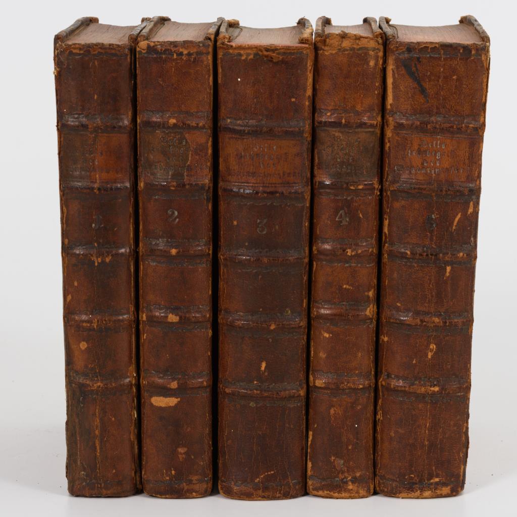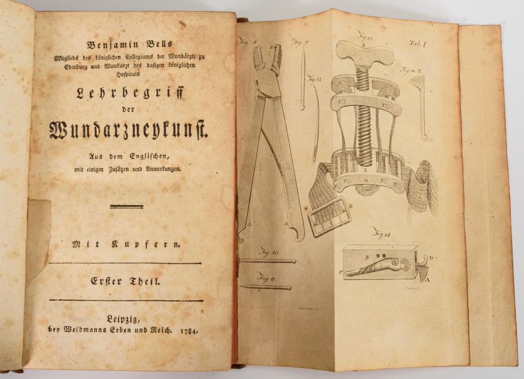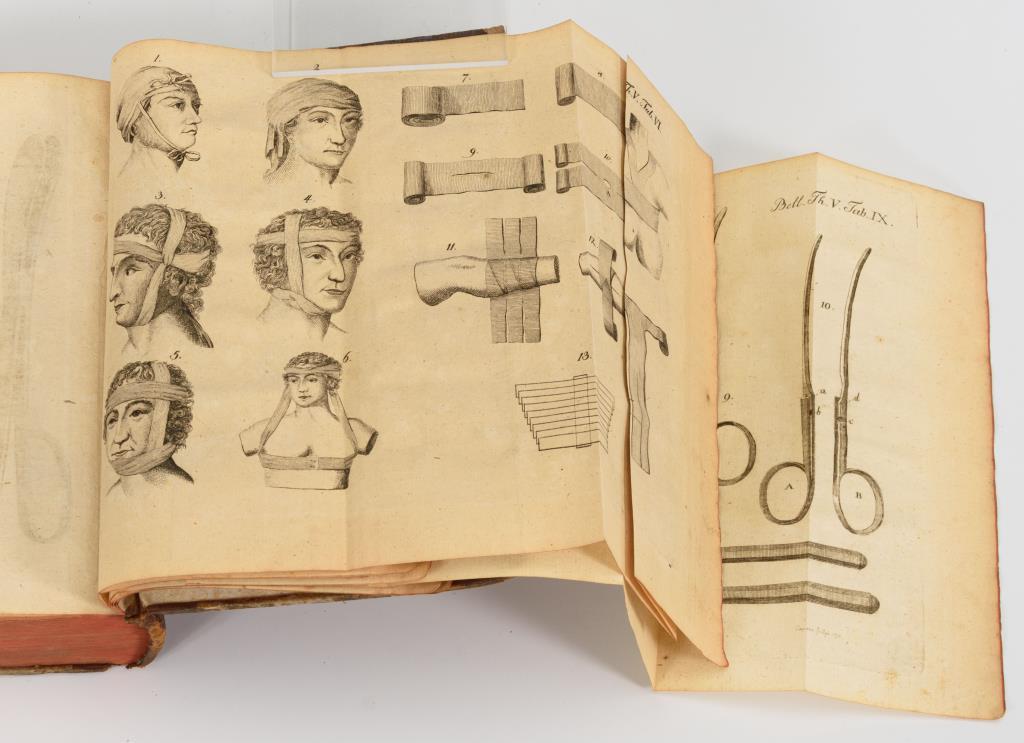Teil 1: (10), 460 Seiten und 5 Kupfertafeln. Teil 2: (2), 457 Seiten und 7 Kupfertafeln. Teil 3: (10), 620 Seiten und 14 Kupfertafeln. 4 Teil: 8, 454 Seiten und 4 Kupfertafeln. Teil 5: 8, 635, (59) Seiten und 10 Kupfertafeln. Die Abbildungen zeigen vorwiegend chirurgische Instrumente oder medizinische Hilfsmittel. Halbledereinband mit Rotschnitt. Alters- und Gebrauchsspuren, dem Alter entsprechend.