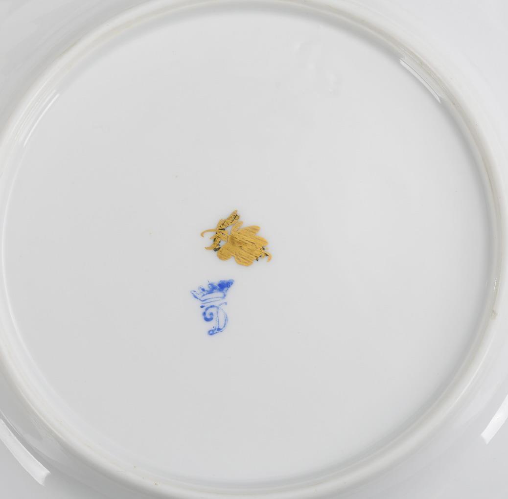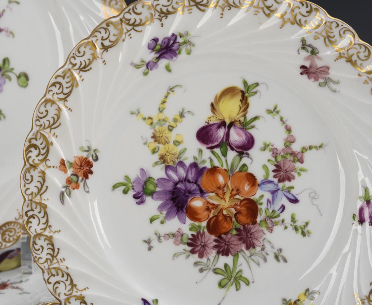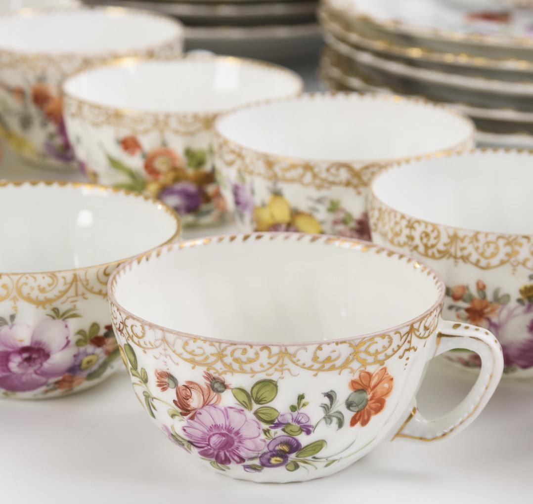 With curved wall or flag, gold lace border and floral bouquets. 11 cups, 2 different saucers, 2 milk jugs, 6 + 6 breakfast plates (Ø 19 and 22 cm), 11 pastry plates (Ø 12 cm) and 1 leaf bowl (L 15 cm). Partially gold somewhat rubbed, 1x small bump on the standing ring of a pastry plate.