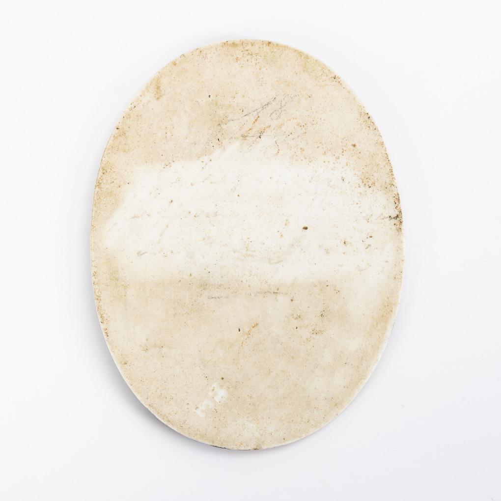 Oval plaque depicting the Madonna with crescent moon and angels. 1 marginal bump, small chip on verso.