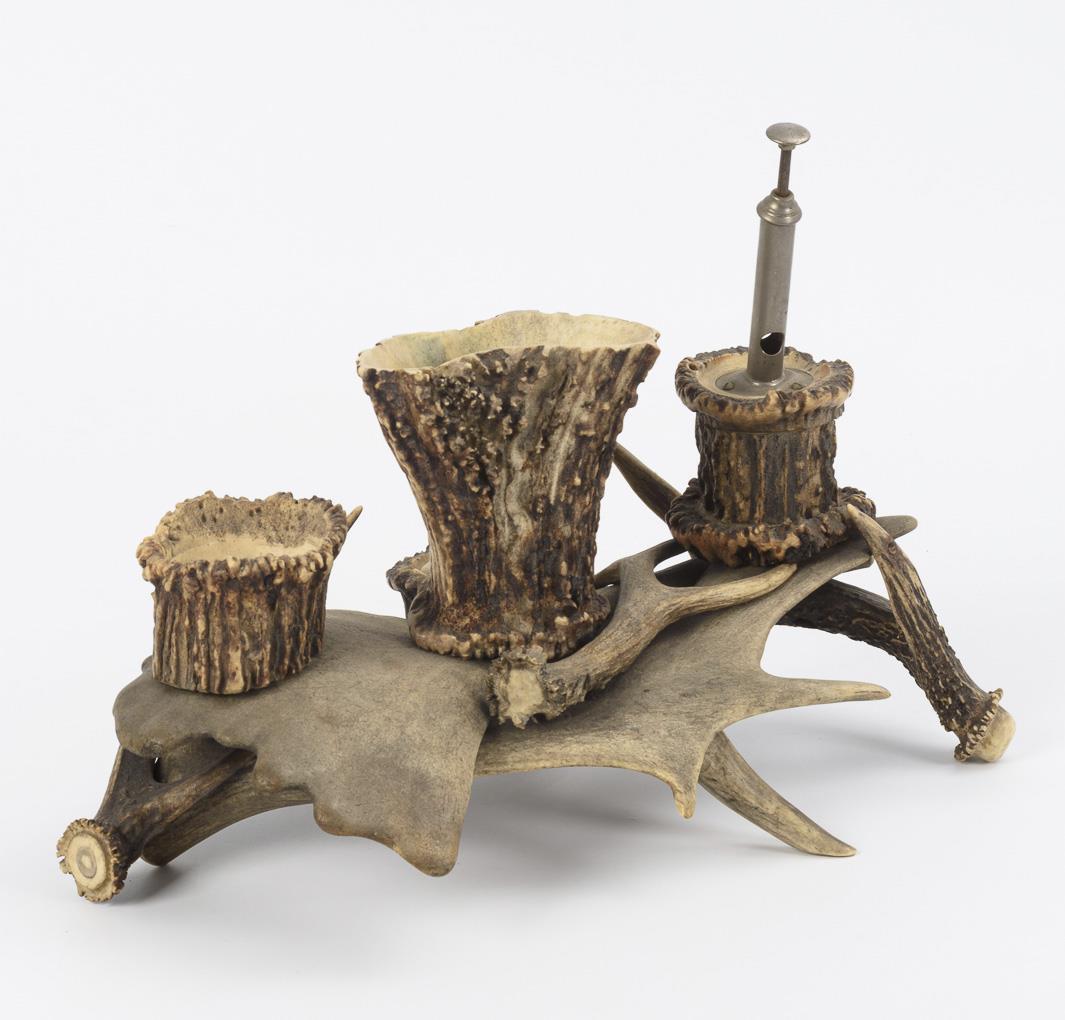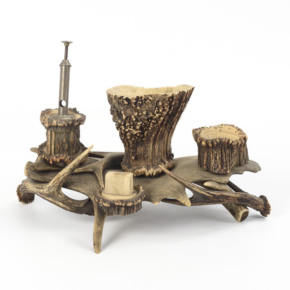 Stand made from the antlers of fallow deer and roe deer. Stand for cigar cutter, cup, bowl and match holder made of antler roses. Match box holder missing.