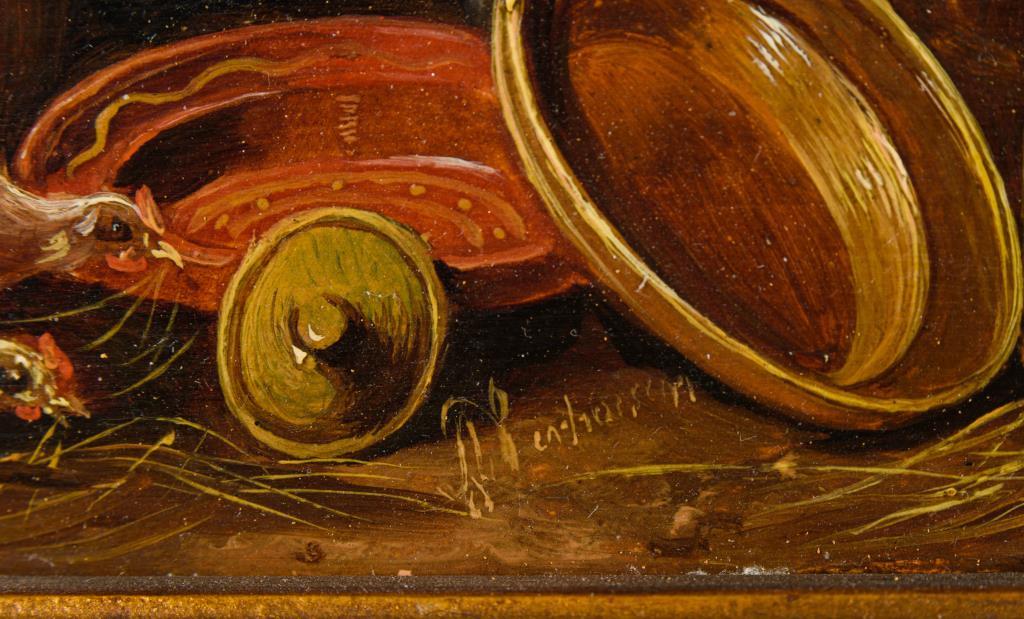 Das Federvieh zwischen Tellern und Krügen im Stall.