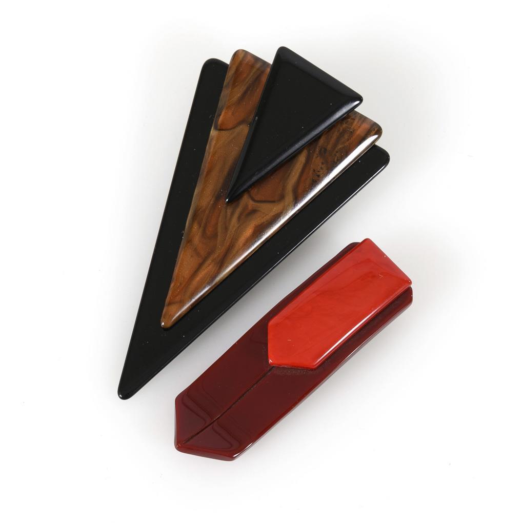 Geometrically designed plastic brooch and clip with metal brooch and clip mechanism.