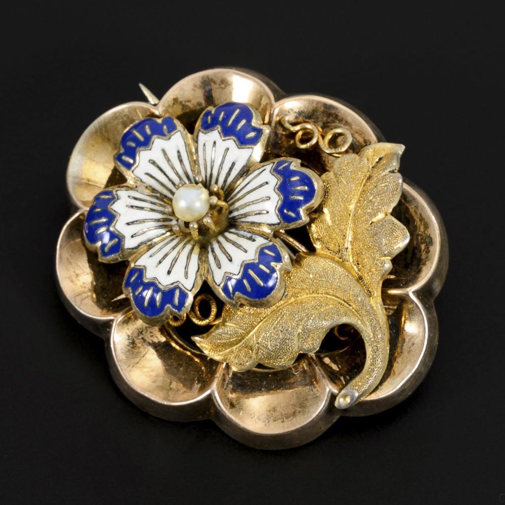 Hollow molded relief brooch with mounted partially enameled flower. C-hook. Center defective faux pearl.
