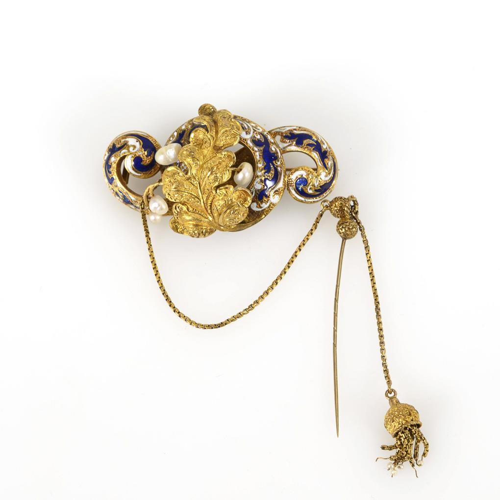 Relief brooch, partially enameled, 4 small pearls and chain suspension with pin. Open back with C hook.