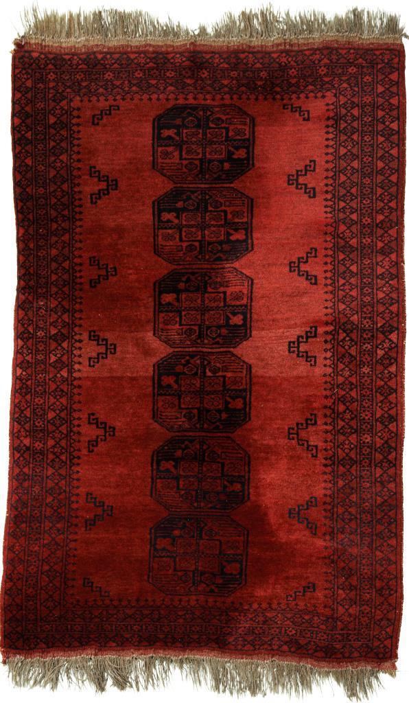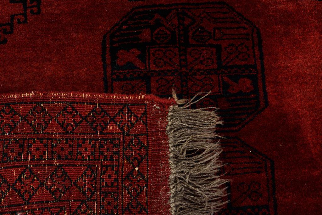 6 in Reihe liegende Ersari-Göls auf offenem Mittelfeld mit begleitenden Hakenelementen. Mehrreihige Bordüre mit geometrisierten Borten. Minimale Alters- und Gebrauchsspuren.