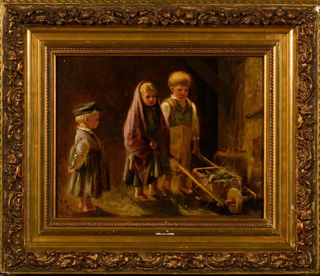 Die Kinder mit einer kleinen Schubkarre voll Blumen und einem toten Vogel. Wenig retuschiert.
