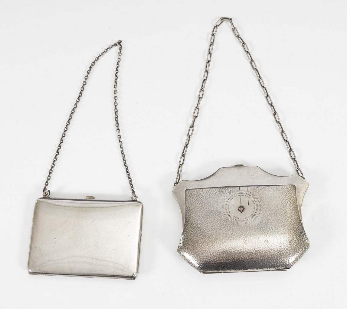 Various small purses or cases on short chain, including 1x Art Nouveau with pink colored stone. Signs of use, 1x more dented.