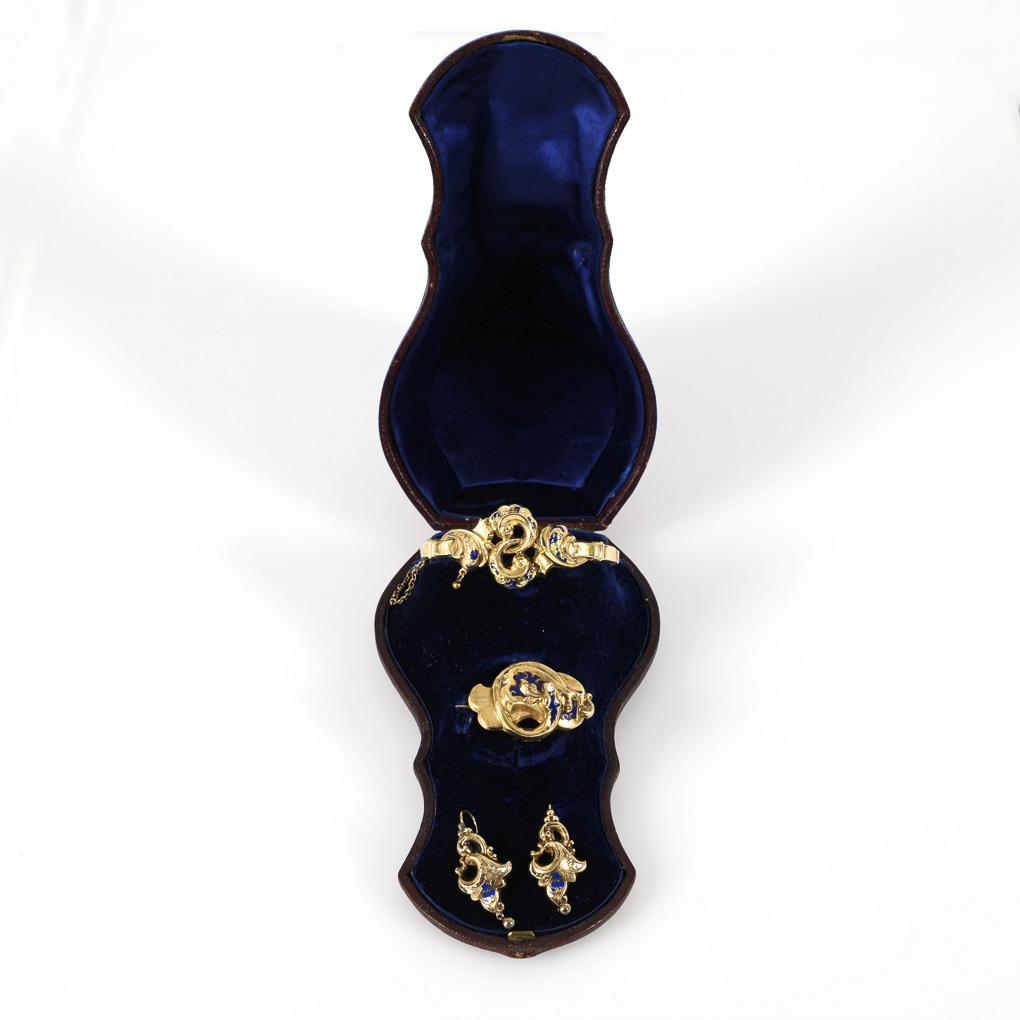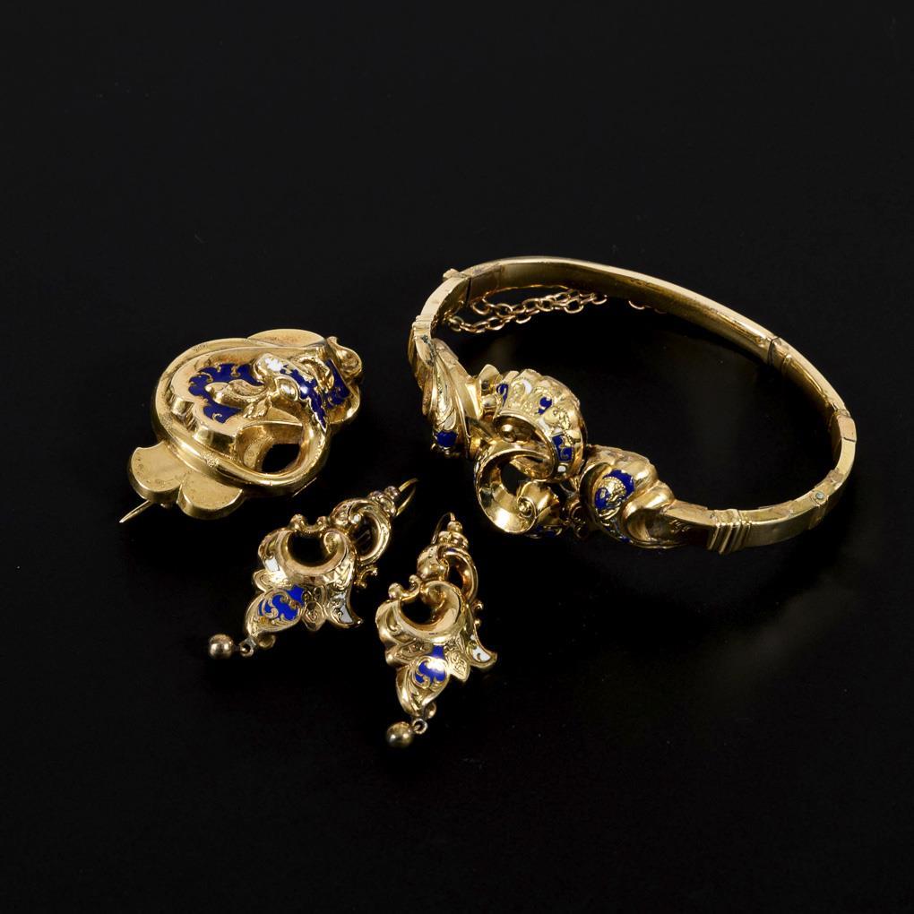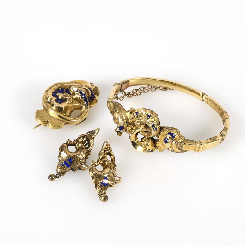 Hollow shaped relief bangle, brooch and pair of earrings with partial enamel. Box lock with safety chain, C-hook, small suspension eyelet, hoop bar. Bracelet with 7 internal repair spots for reinforcement,