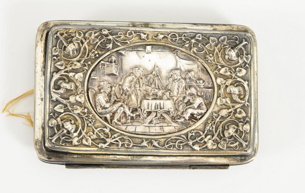 Various small cases, 2x floral engraved, 1x figural relief. Partly heavier signs of age and use.