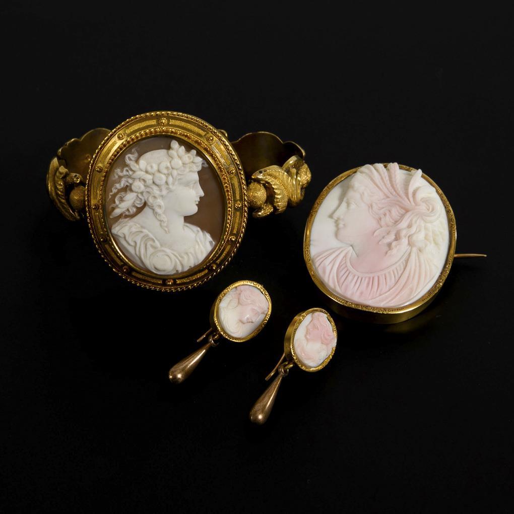 Hollow shaped relief bangle. Centered large shell cameo with antique cut female profile head in frame setting, with ornate frame. Box lock with safety chain. Brooch with large coral cameo with antique cut female profile head in frame setting. C hook. Matching earrings with coral cameos and suspensions. Suspension hook.