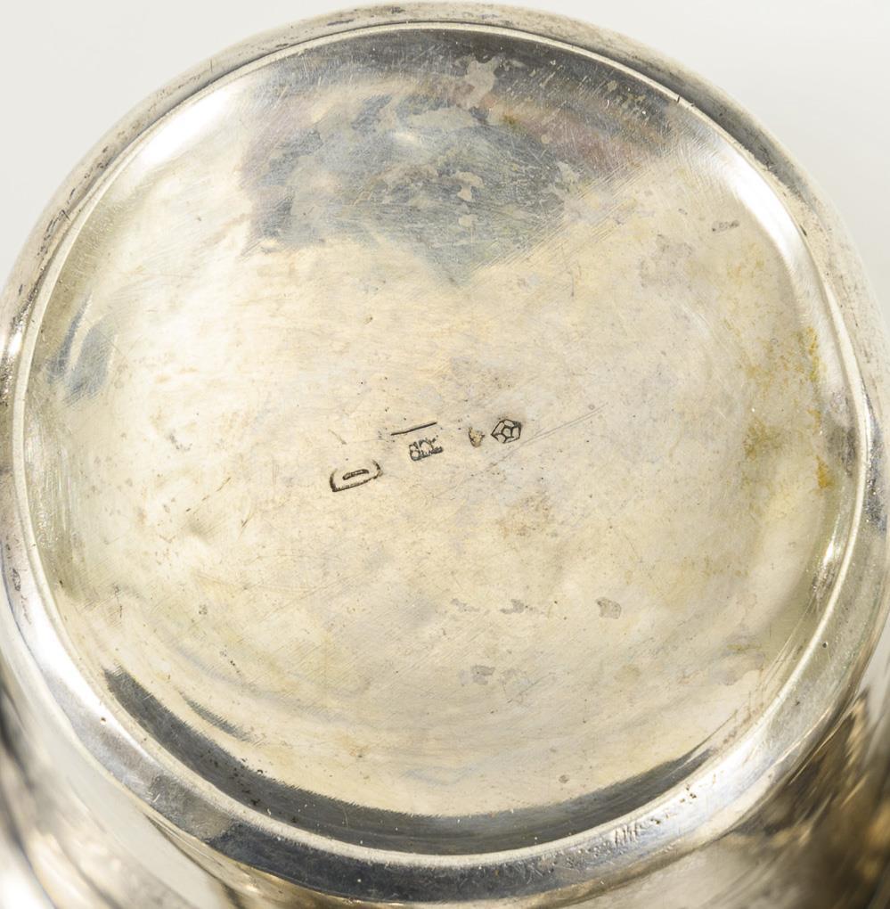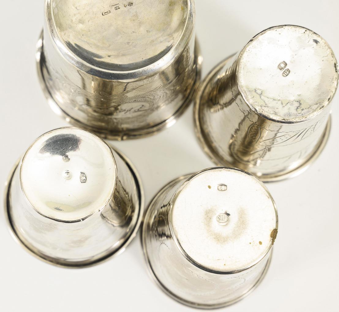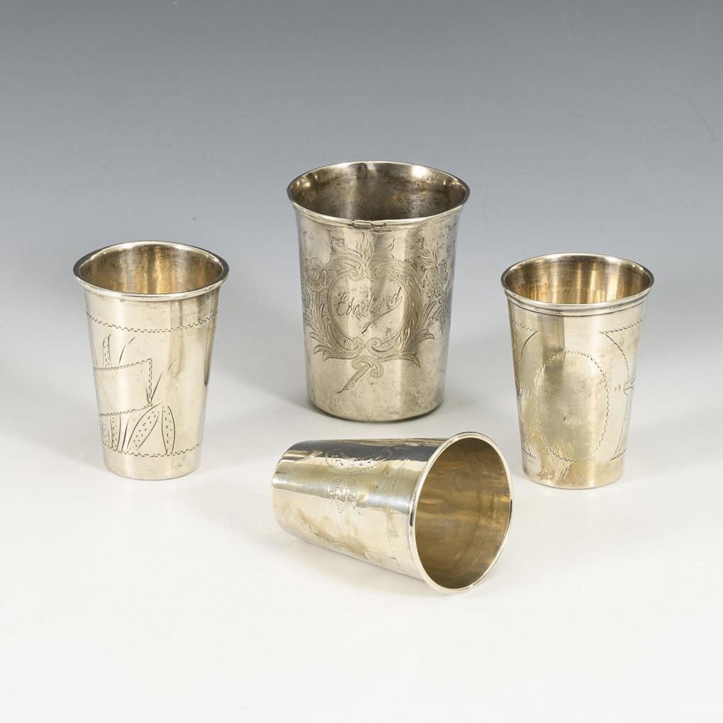 Conical cups with floral engravings. 3x similar, 1x slightly larger with engraving "Eberhard". Heavily dented, 1x with solder joints.