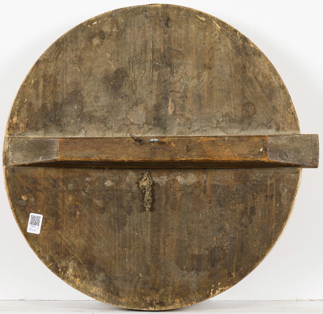 Saint with scroll before ornamentally designed background. Missing at the edges.