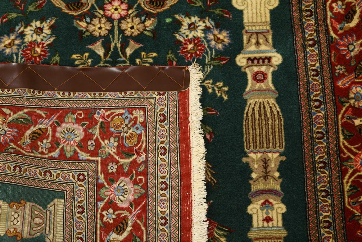 In the center field, a curved mihrab with pomp columns, oil lamp and floor vase with flowering branches and various birds against a blue-green background. Multi-row floral border with birds, fringe finishes. Verso leather reinforced edges. Light signs of age and wear.