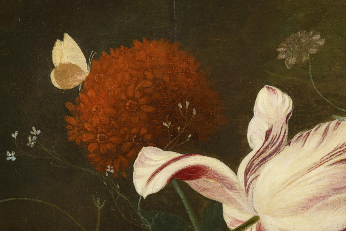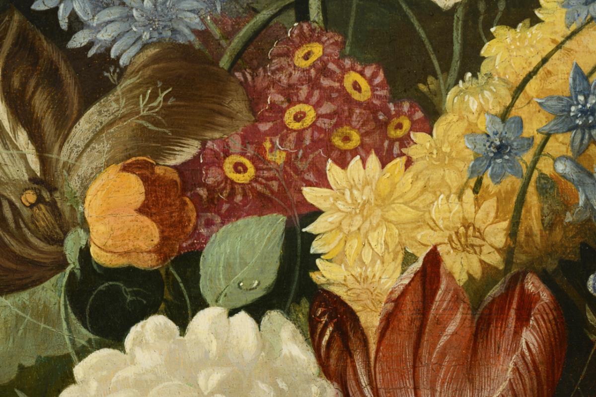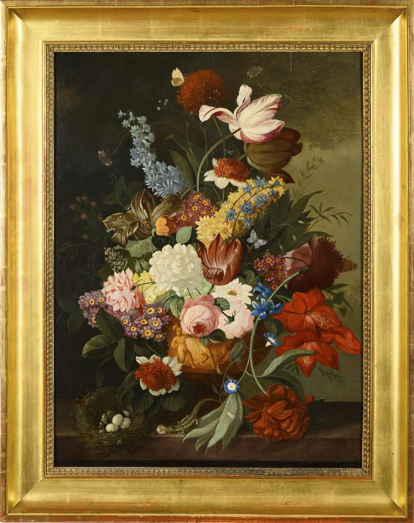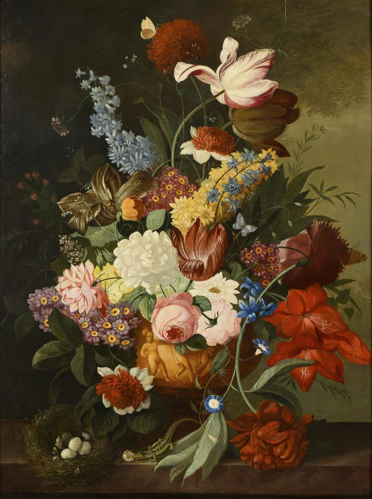 Lush still life with style of the baroque old masters with various flowers in antique vase with genii. Light traces of age.