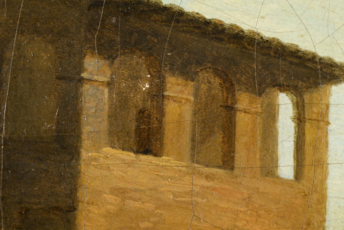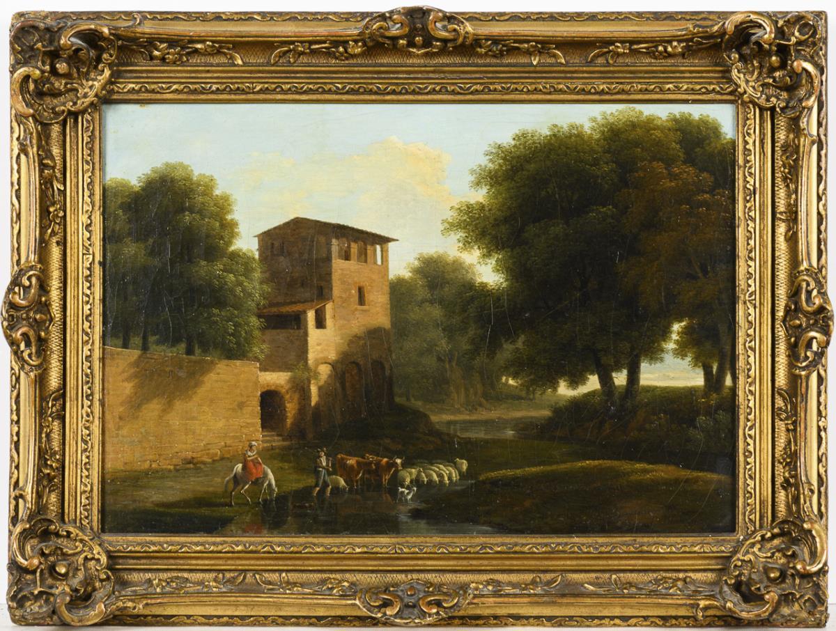 Drover with young woman on a horse by the shallow river near a building in the warm sun. Slight signs of age.