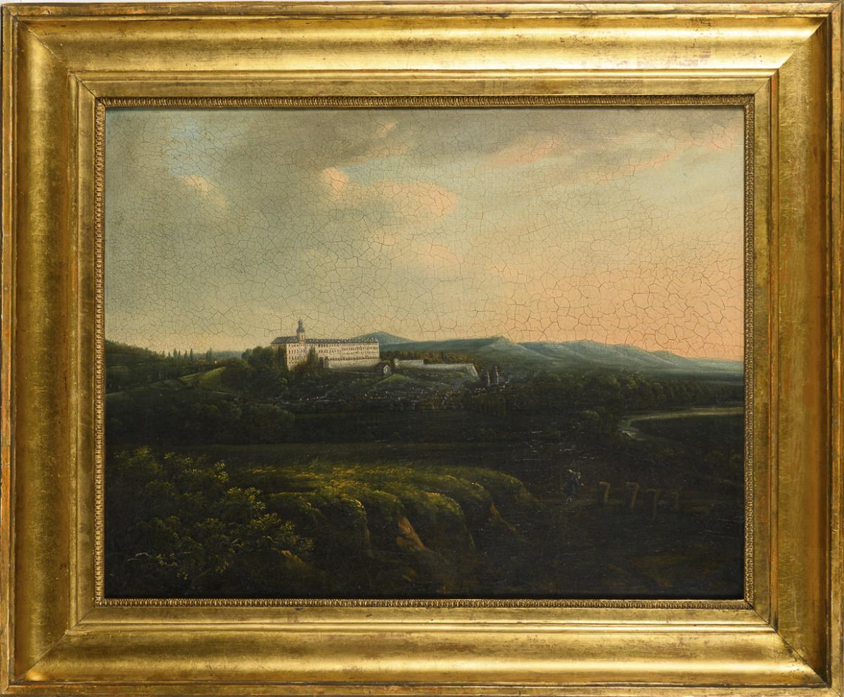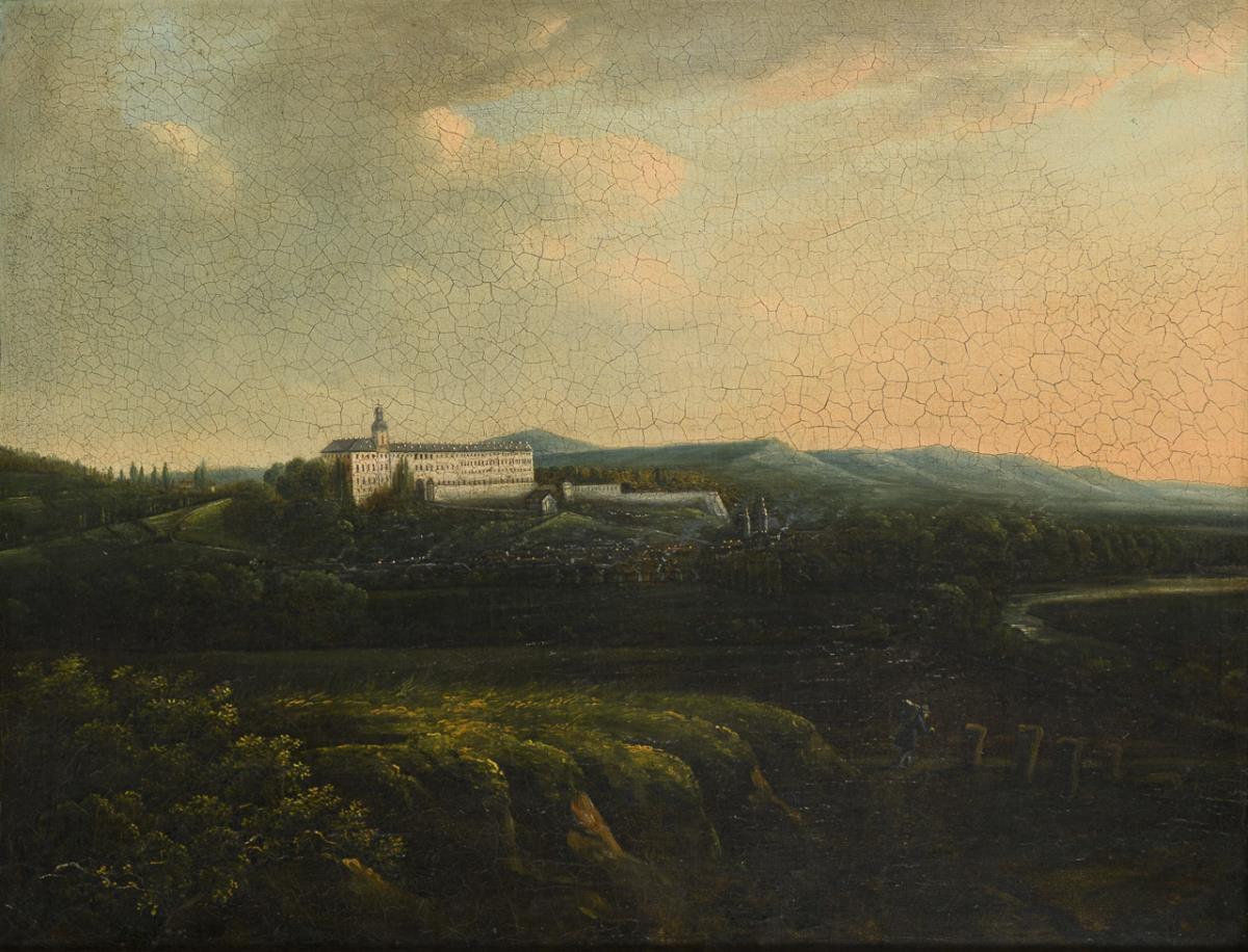 Staffage figure in the evening on a hill with a view to the city and the Heidecksburg above. Traces of age.