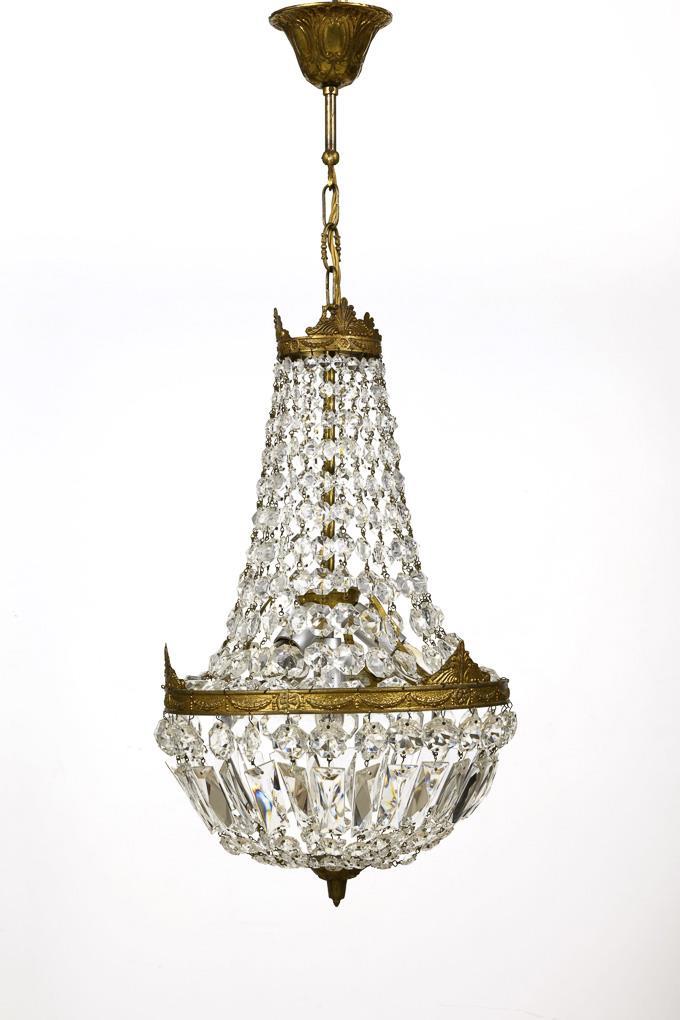 4-light, teardrop-shaped hanging lamp with rich prismatic hanging on brass frame with antique relief decoration and palmette canopy. Signs of age/use, prismatic hanging partly loose.