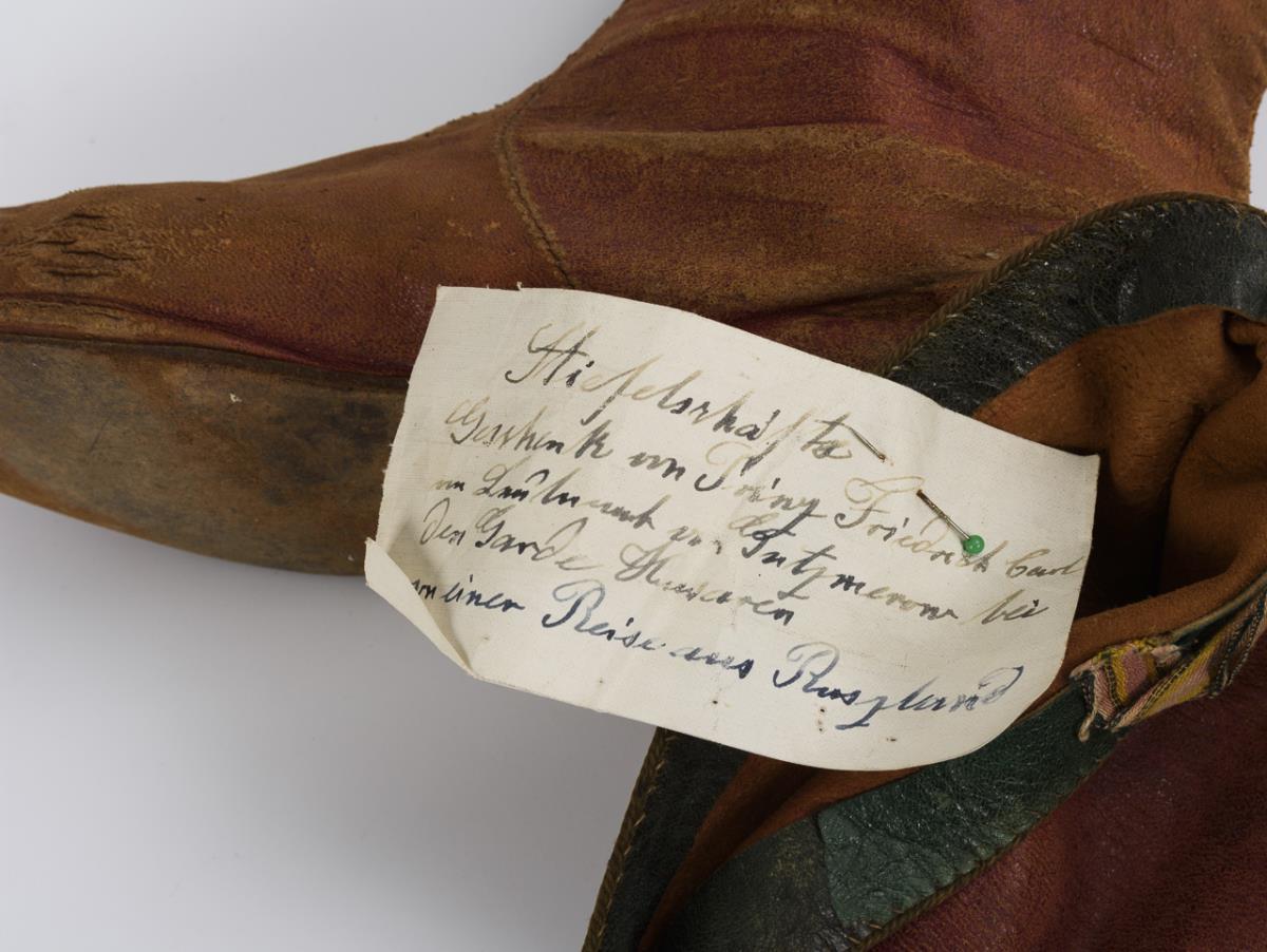 Unlined men's soft leather boots with stitched leather soles. Attached old slip of paper with handwritten note: "Gift from Prince Frederick Carl [of Prussia] to Lieutenant von Gutzmerow in the Guard Hussars" and probably by another hand: "from a trip from Russia". Signs of age/use.