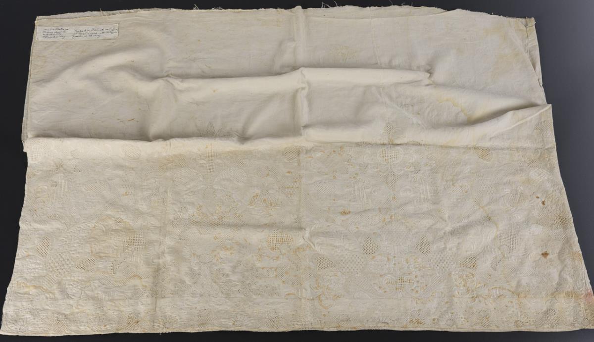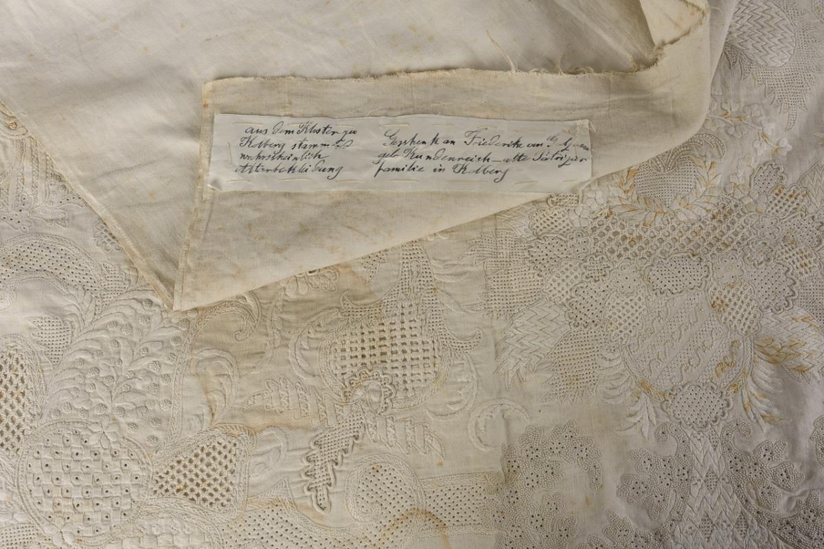 Sewn on handwritten note "Coming from the monastery in Kolberg, gift to Friederike von Gutzmer(?), née von Kundenreich" in Kolberg. Altar cloth sewn together from 3 weaves of 85 cm each with baroque-inspired ornament across the entire width and in 57 cm height. Various techniques: satin embroidery, petit point embroidery, knitted and crocheted inserts, partly backed with fabric. Torn off lengthwise outside the embroidery, strong signs of age / wear.
