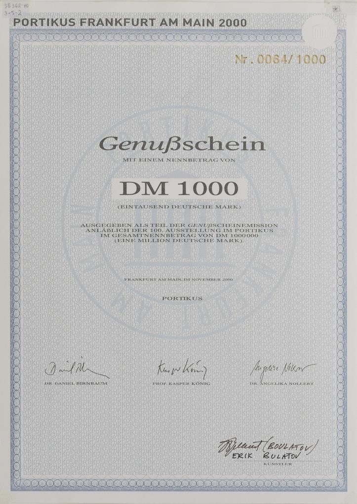 Felt pen/Genusschein, special edition for Portikus, Frankfurt am Main (64/1000). Signed lower left, signed on verso. 2000.
