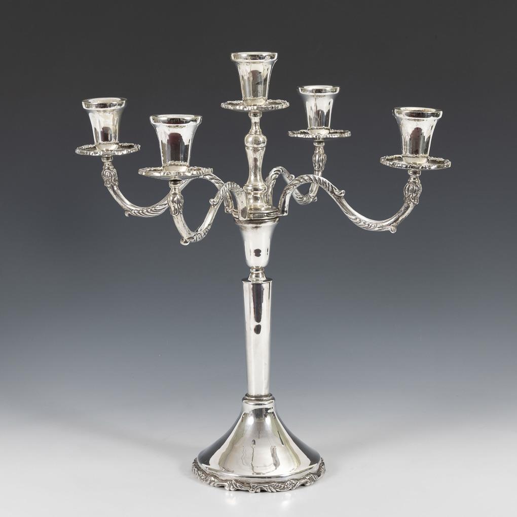 Large candelabra with unscrewable arms and relief edges. Can also be used as a 1-burner candlestick. Signs of use.