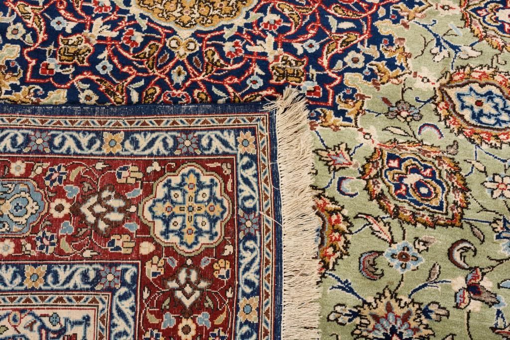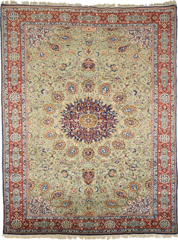 Wolle, handgeknüpft. Polychromdekor mit vorwiegend Blau, Rot und hellem Grün.220 x 316 cm.