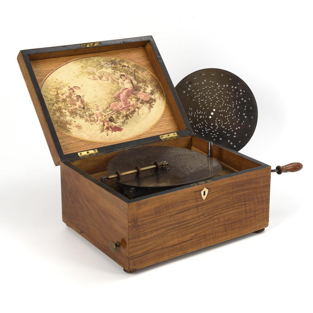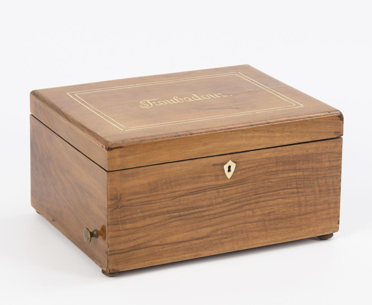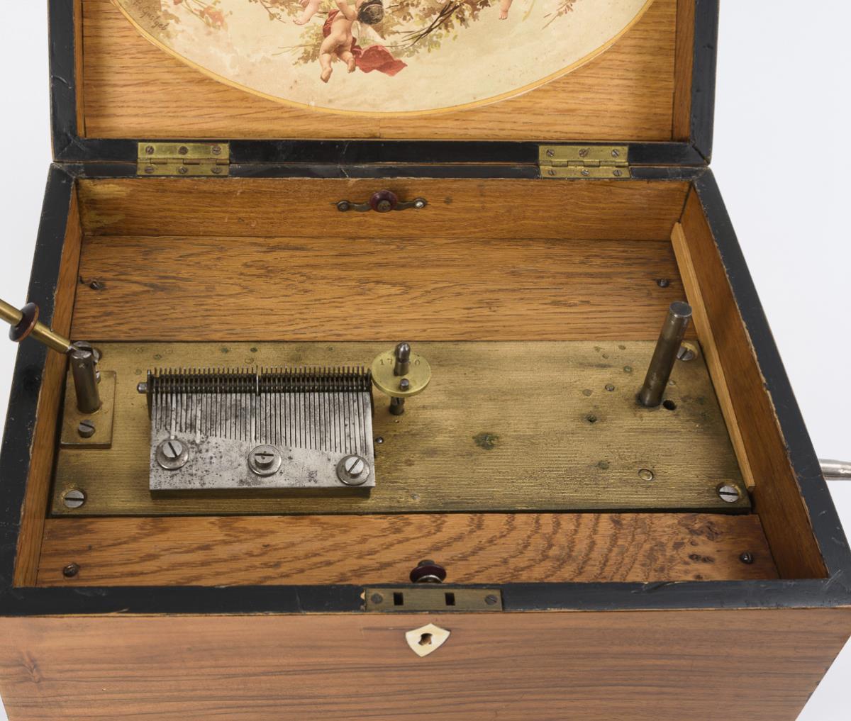 Music box with writing and thread inlays of imitation ivory on the hinged lid; inside oval representation after Boucher. Playing mechanism with fluted cast iron plate, central drive with no. "17250" and marking wheel with dampers. Indistinctly labeled perforated plates (e.g. "monastery bells"). Plays with a beautiful sound, minor repairs to the veneer, dry crack in the lid, otherwise a few signs of age/use.