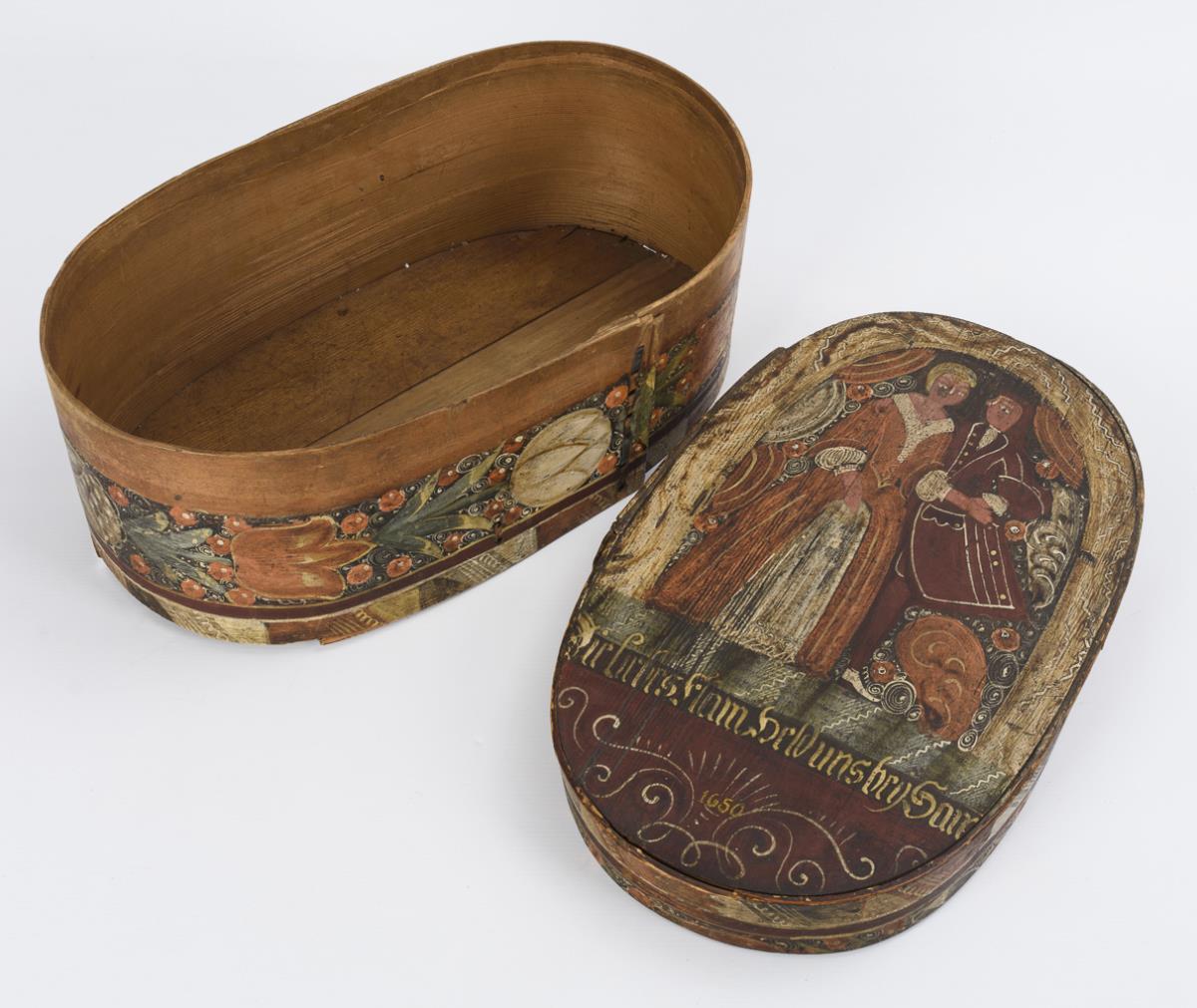 On the wall circumferentially painted large flowers in marbled framing. On the lid large pair in arched framing; including motto "Die Liebes Flam held uns beySam" and date "1650". Some missing parts on the wall and lid wall, clamping seams replaced, bottom partly replaced, signs of age / use.