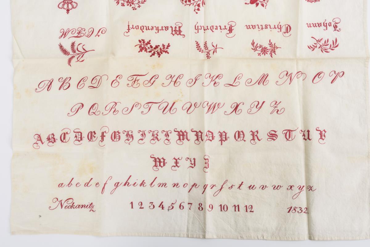 Very finely executed embroidery on both halves of the cloth: Alphabet in Antiqua and Fraktur, numbers from 1-12 and place name Neckanitz [Saxony] and date 1832. Other half with 15 names or monograms of the Markendorf family under various branches/symbols. Minimal holes, light brown spots.