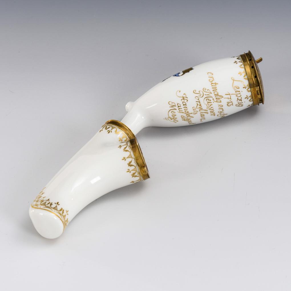 Pipe bowl with sack of juice and gold mounts (585/Meisterzeichen/Unikat gepunzt). On the front the coat of arms of the city of Leipzig, verso the designation "Leipzig 1713 first appears Meissen porcelain as a commodity at the fair".