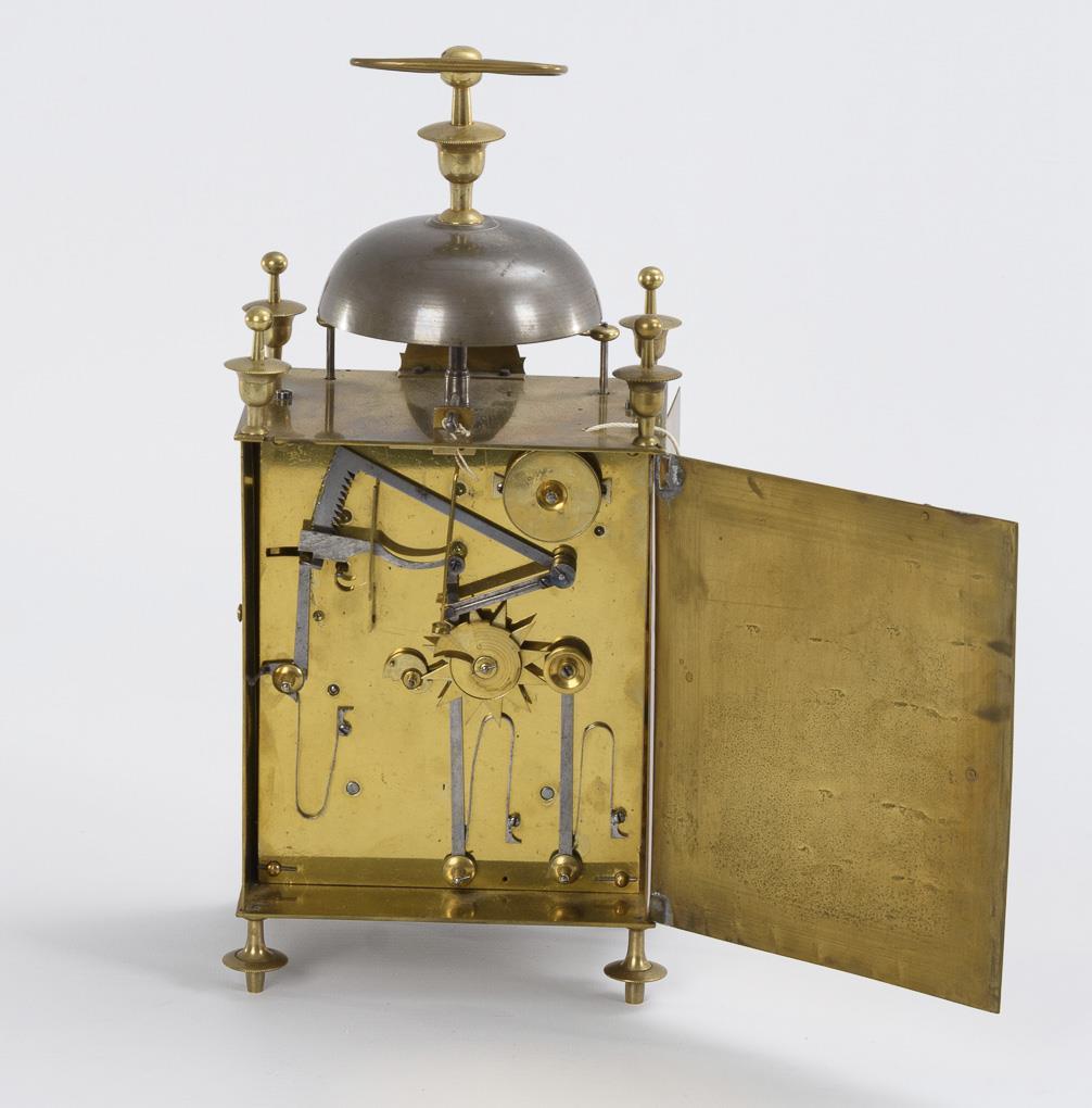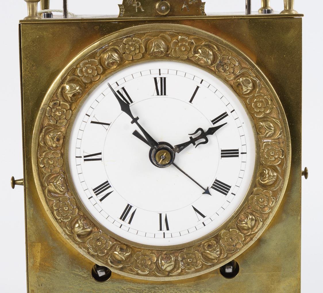 Rectangular travel alarm clock in the style of a turret clock with plastic vase decoration at the corners and crowning bell with movable carrying handle, lateral rope pull for repetition, small front arch plate for regulation. Minute hand loose, traces of soldering.