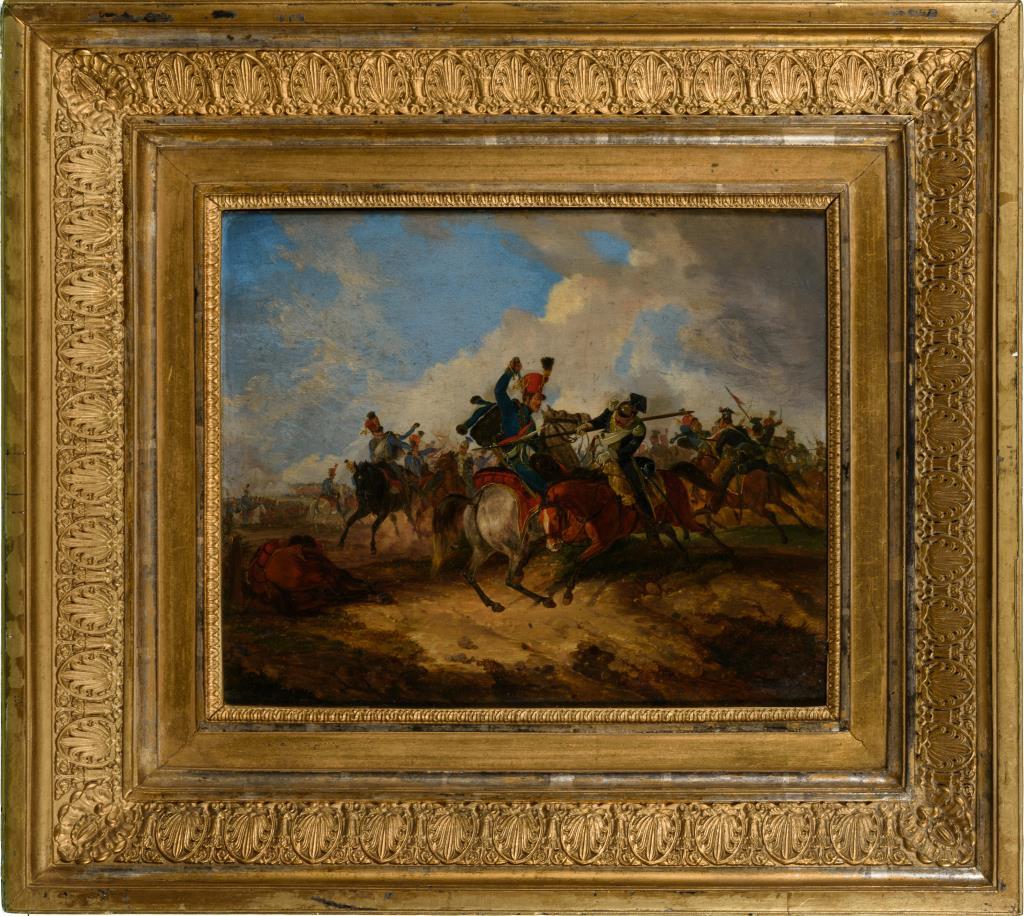 Reiter im hitzigen Gefecht auf weitem Feld unter wolkigem Himmel. Leichte Altersspuren.