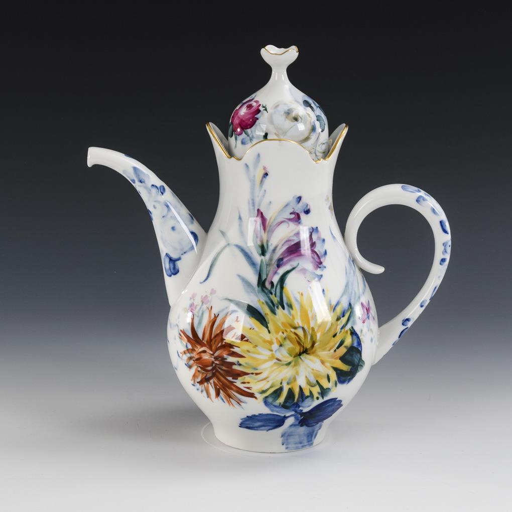 Underglaze blue and polychrome onglaze painting, gold staffage. H 27,5 cm.