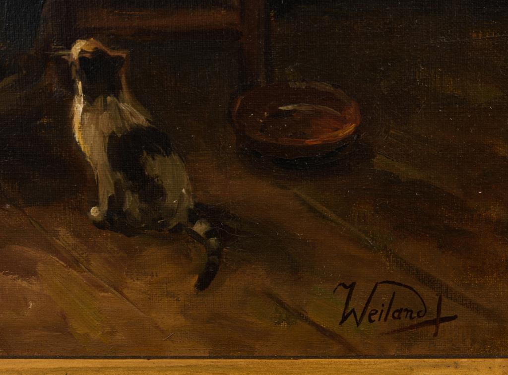 Stubeninterieur mit Mutter bei der Handarbeit, einer kleinen Katze und der Tochter.