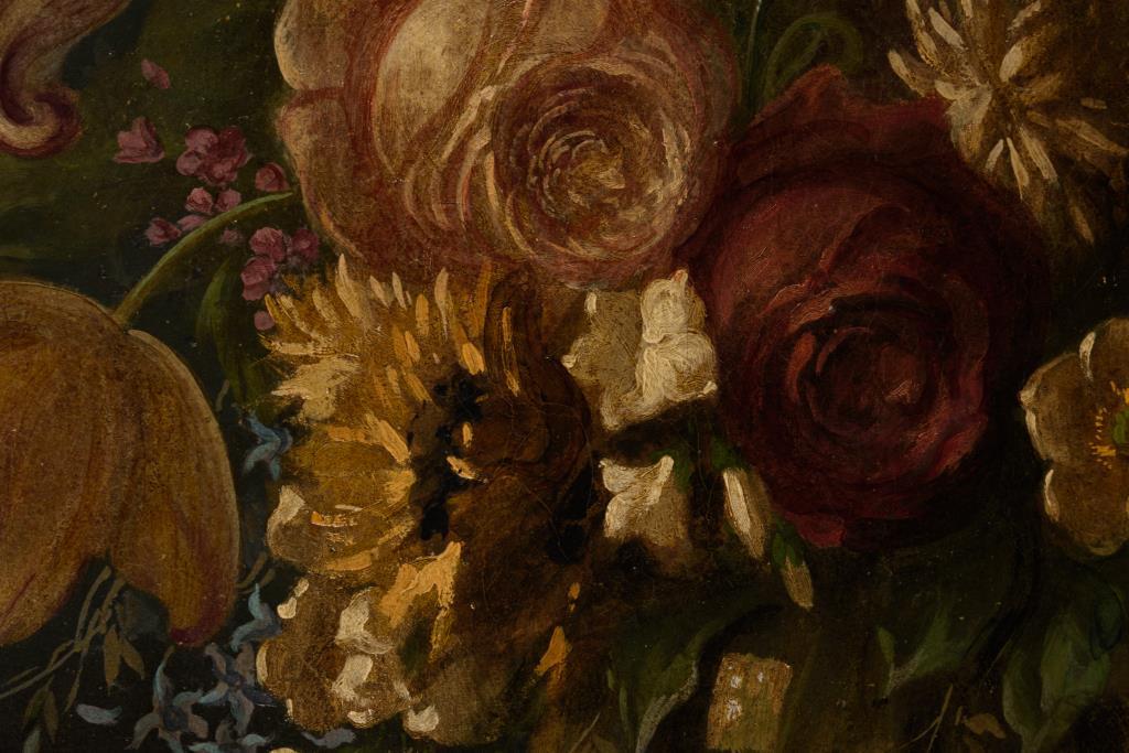 Großer Blumenstrauß in transparenter Glasvase neben Melone, Pfirsichen und Trauben. Leinwand doubliert.