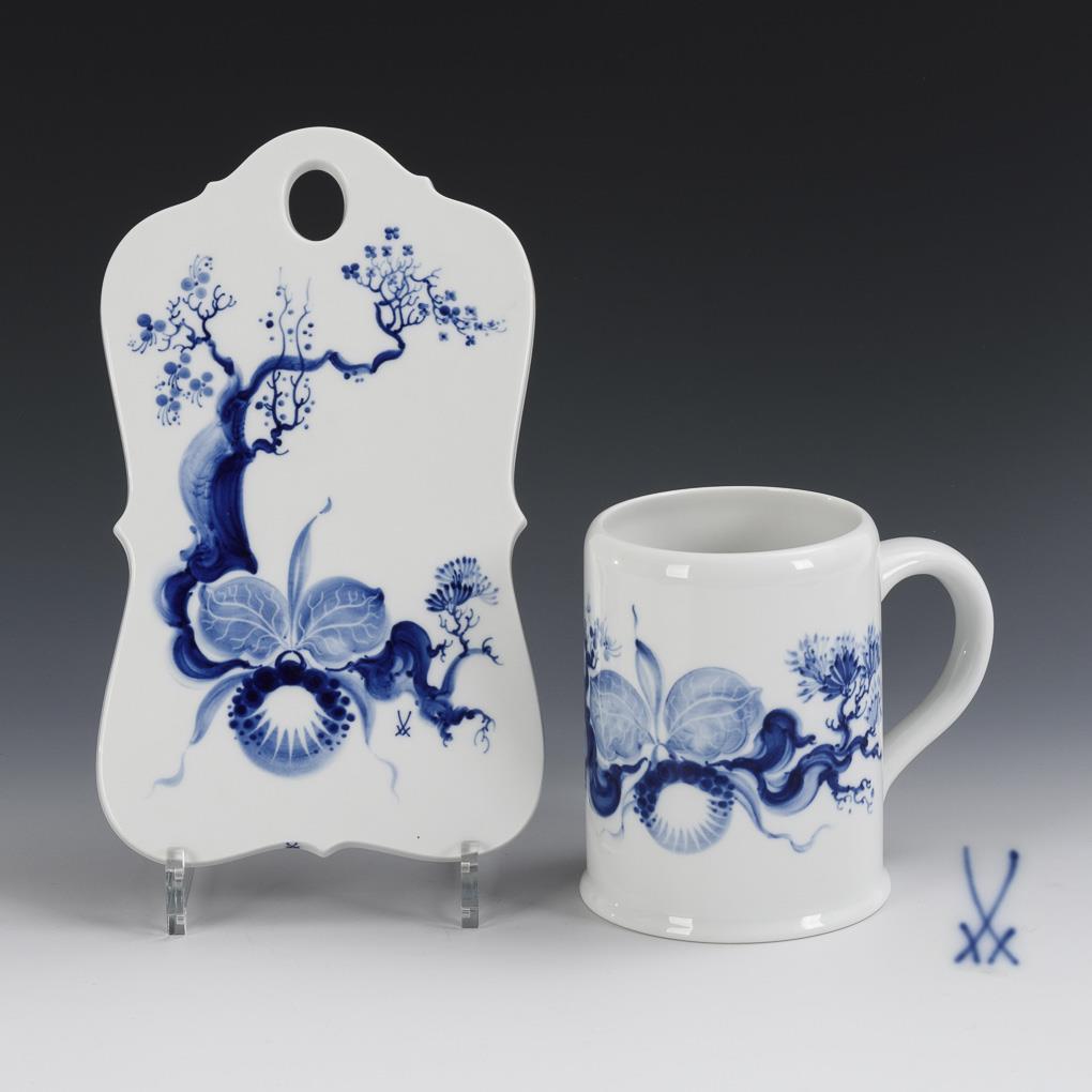 Underglaze blue painting. Board (L 26,5 cm) and 1 beer mug (H 13,5 cm).