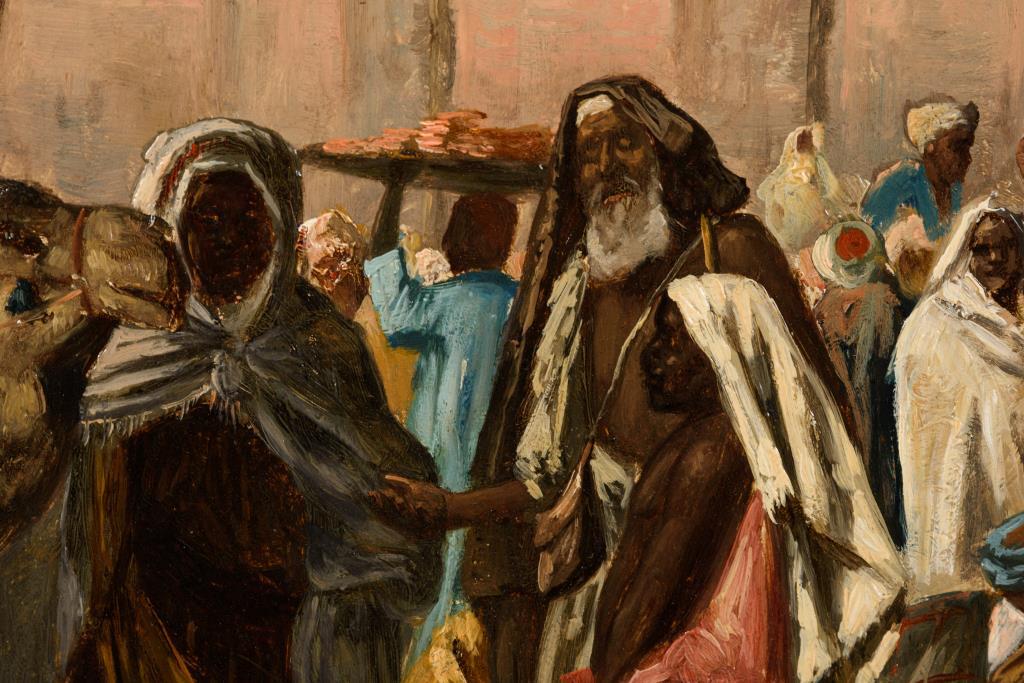 Orientalischer Markt mit Kamelreiter und vielen Händlern im Sonnenschein.