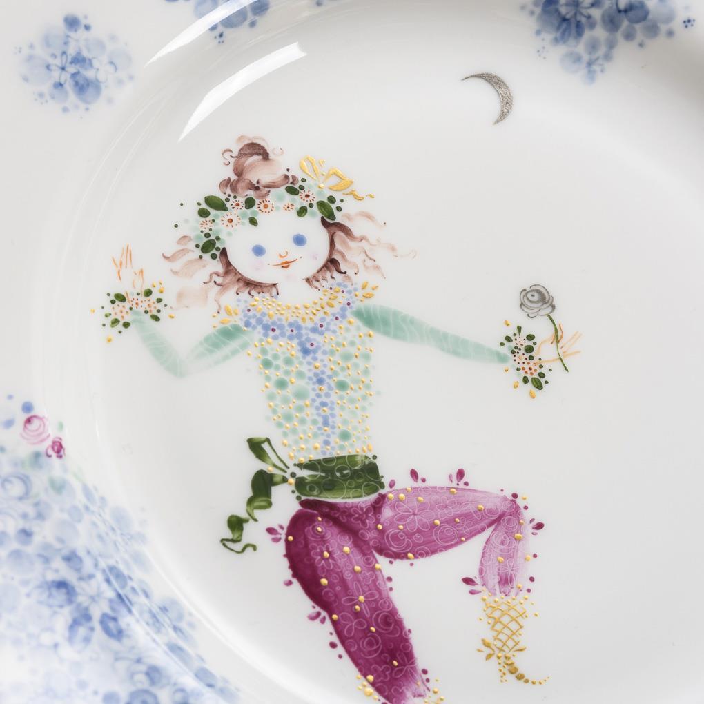 Underglaze and onglaze blue painting, polychrome onglaze painting, gold and platinum decoration. Ø 20.5 cm.