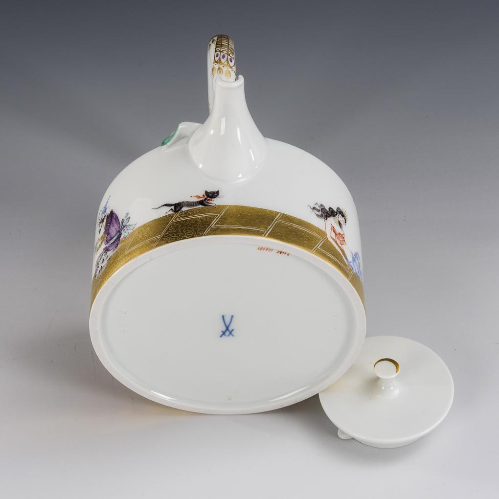 Form "Japangeschirr". Cylindrical teapot with high handle, painted with oriental scenes.