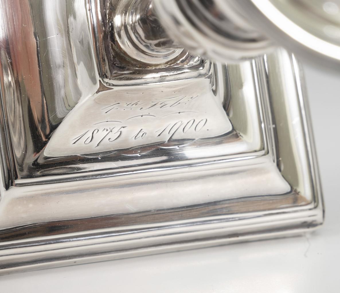 1-flame candlesticks with short baluster stem and stepped square base. Each engraved "4th Feb. 1875 to 1900". Signs of use, 1x with solder joint on the stem.