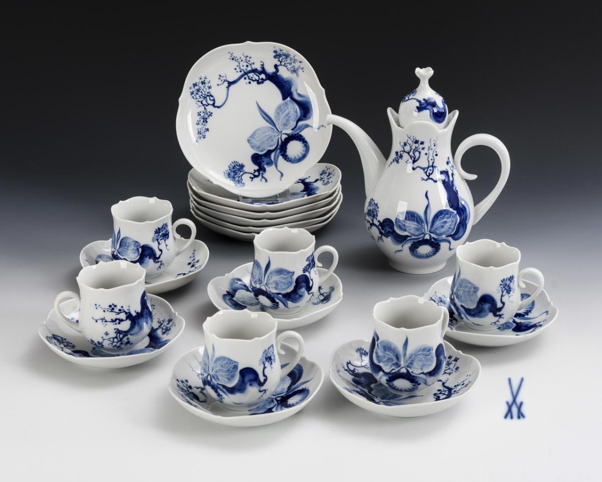 19 pieces of a coffee set "Blue orchid on branch". Meissen.